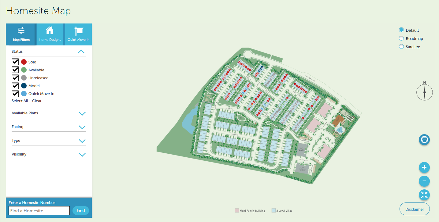 The community’s homesite map shows a mix of villas and multi-family residences, with: