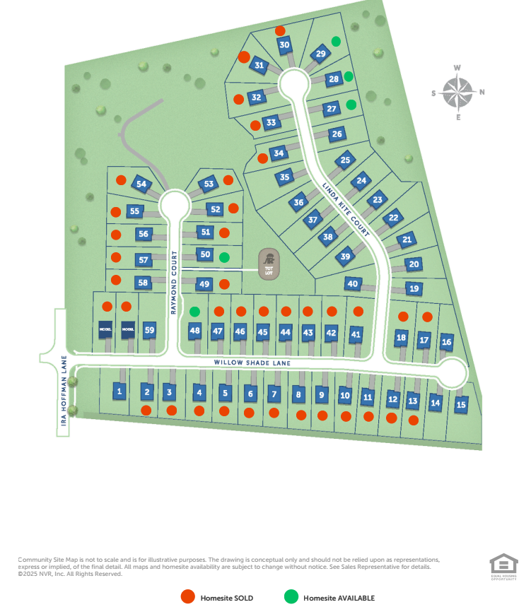 The site plan layout shows how Kite Acres is organized: lot placement, phases, green areas, road access, and model allocations. Use this visual so buyers can see where future homesites will be and which are available/sold.